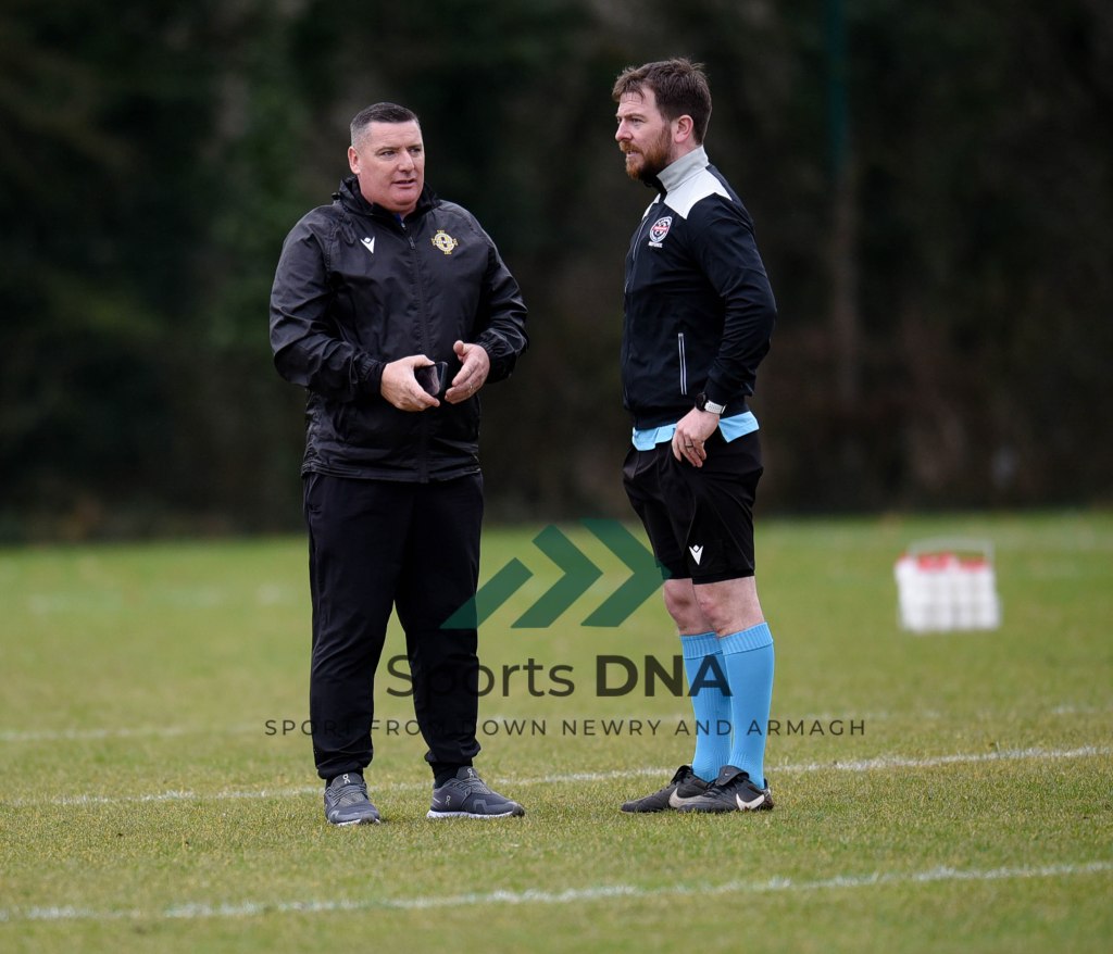 The pendulum seemed to swing the other way after the break with Newry Celtic getting to grips around midfield, where brothers Stephen and Mark Hughes had a ding dong battle against each other. After a spell of pressure on the hour mark Newry Celtic forced a corner and up steped Keith Johnston to swing the ball straight to the back of Joe Goodwill’s net.
