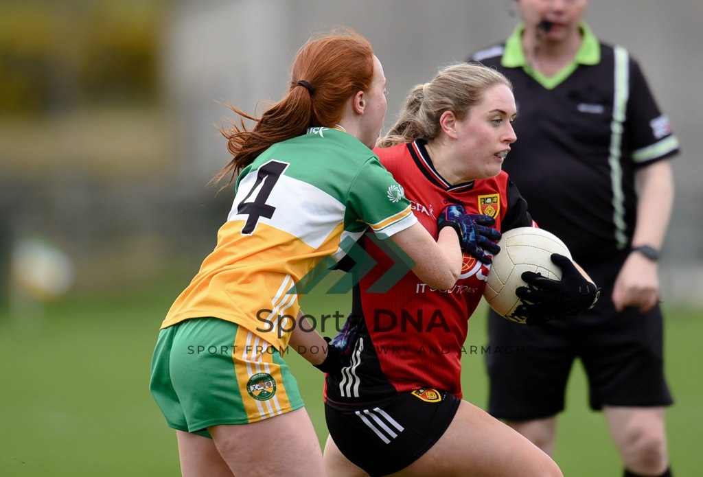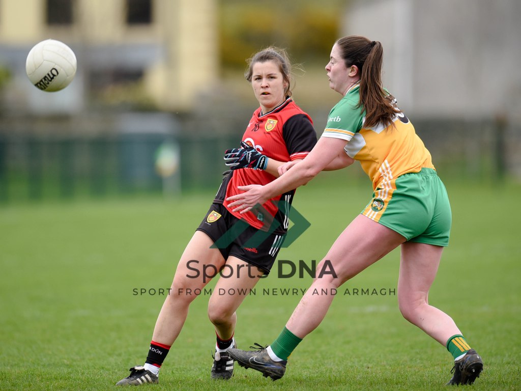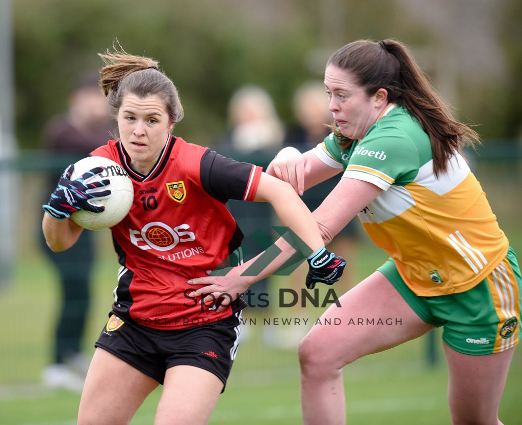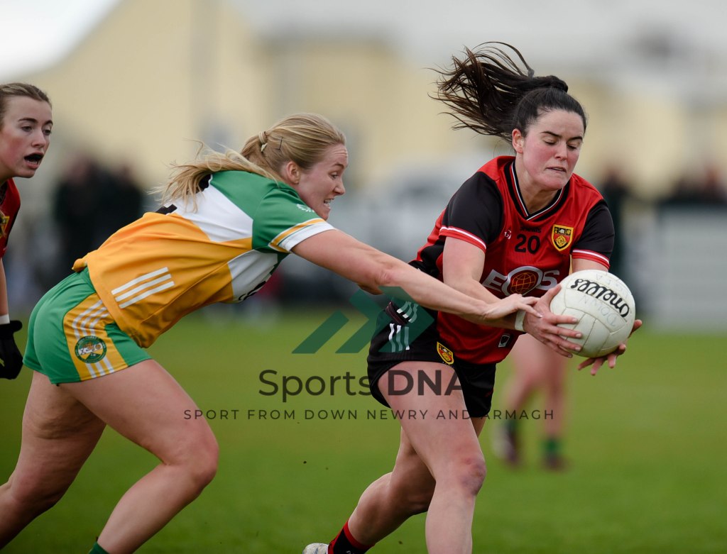 Meghan Doherty showed she is one of the best players in the Country. The Carryduff player bossed the midfield, driving Down forward. Twice in this spell she overturned the ball and set up goal scoring chances for Natasha Ferris and Aisling Cull, only to see Offaly keeper, Lauren Dunne pull off two great saves. When the inevitable Down goal did arrive it came with a huge stroke of luck. Niamh King’s long range shot just fell sort of the posts, but took a wicked bounce off the pitch and flew past the Offaly keeper into the back of the net. This was a massive turning point in the game and in truth Offaly never really recovered. Another Fitzpatrick score, this time from a free was the last action of a close enough half and seen the home side lead 1-7 to 1-2.