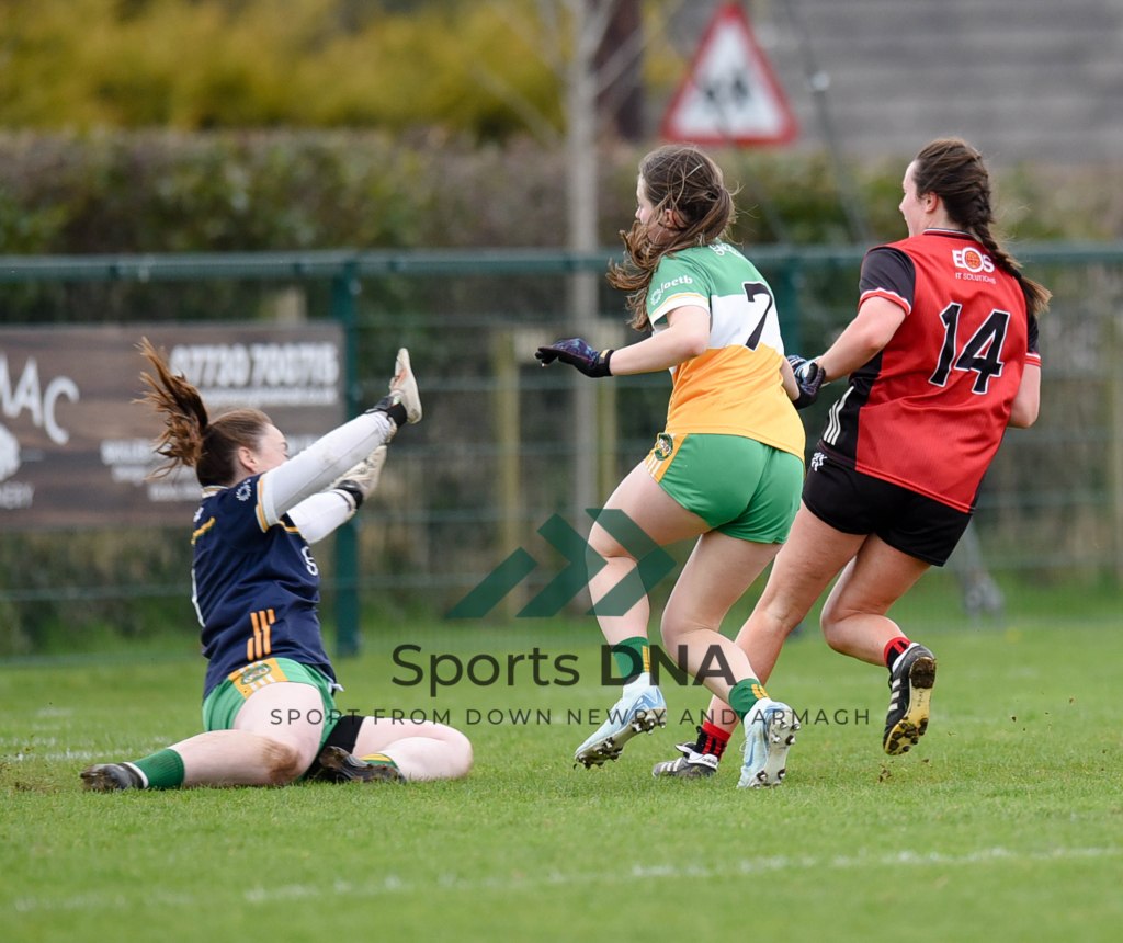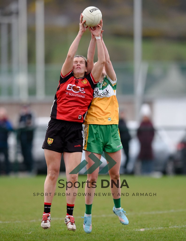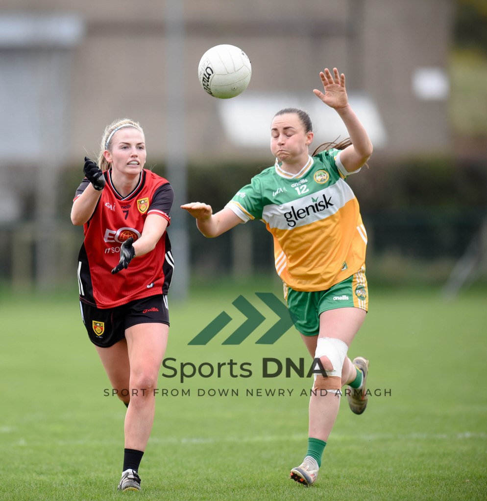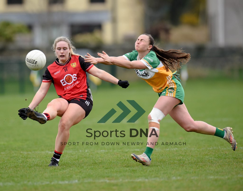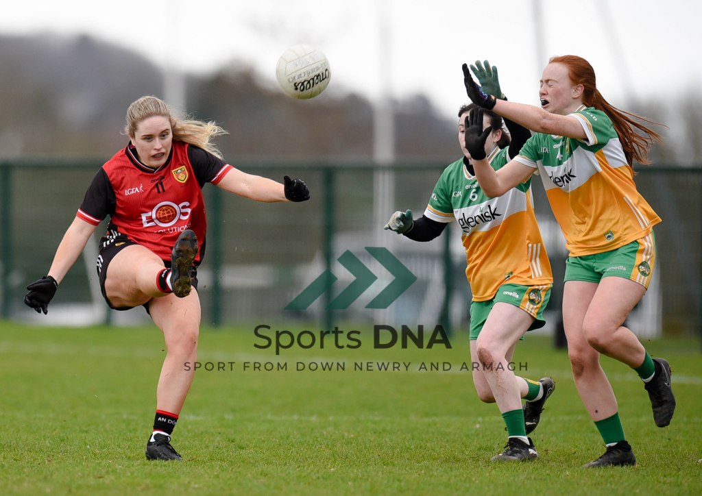 Offaly converted another two frees early in the second half, but these were quickly wiped out when Niamh King got her second goal of the match. Eva Hicks found the Castlewellan forward with a super ball over the Faithful County’s defence and King calmly rolled the ball off her right boot and past the keeper.